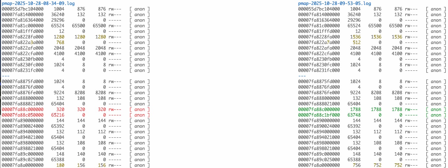 1 | icdiff pmap-2023-07-27-09-46-36.log pmap-2023-07-28-09-29-55.log | less -SR |