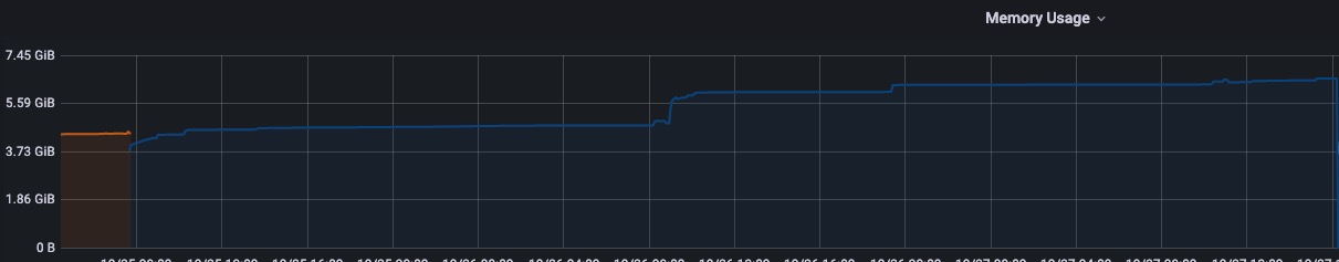 RSS从启动之后,就是一路增长,由于是测试机,业务量小,以53M/小时的增量增长。